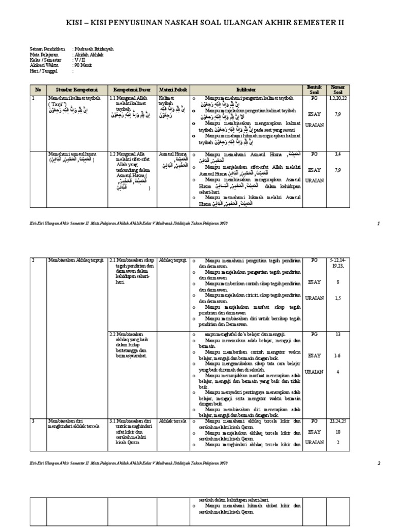 266090101 Kisi Kisi Akidah Akhlak Kelas 5 Semsester 2 1 Doc