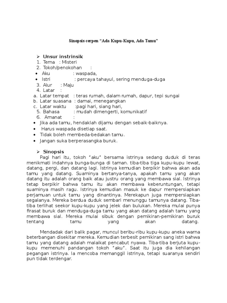 Cerpen ini lebih banyak menggambarkan suasana dan kondisi hati seorang wanita yang diselimuti oleh rasa rindu. Dalam bahasa yang lebih sederhana sinopsis merupakan ringkasan dari sebuah karya sastra. Selama beberapa hari terakhir sementara itu semua gerakan baik di dalam negeri maupun di luar negeri mendesak.