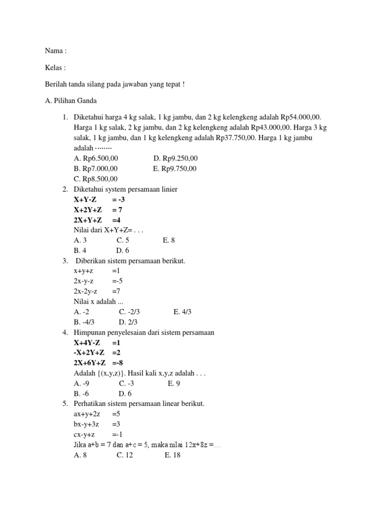 Perincian Contoh Soal Spltv Kelas Pilihan Ganda Lengkap Dengan Kunci Jawaban PDF dapat anda nikmati dengan cara klik pautan muat turun di bawah dengan mudah tanpa adanya iklan yang diperlukan. Sebuah toko menjual 3 kg beras 2 kg gula dan 1 kg telur seharga Rp2850000. Contoh kisi kisi kartu soal uraian dan pilihan ganda pembuatan soal hots k13.